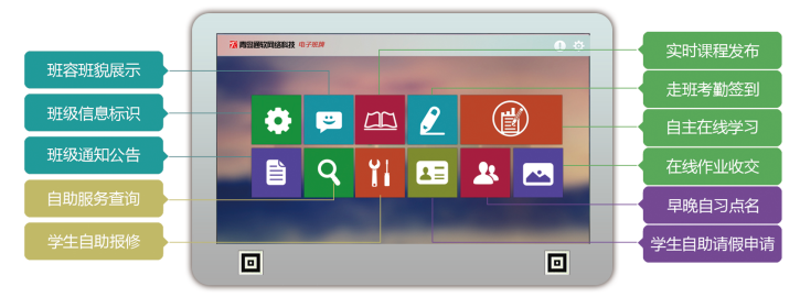 通過(guò)電子班牌可實(shí)時(shí)顯示學(xué)生個(gè)人的課程表,展現學(xué)生下節課課程內容,包括上課時(shí)間、課程名稱(chēng)、任課教師、教室位置等等。學(xué)生還可以進(jìn)行修改密碼、保修、交作業(yè)、請假等操作。