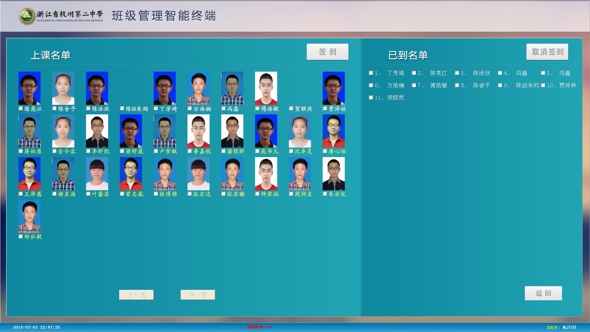 通過(guò)電子班牌實(shí)現早晚自習點(diǎn)名功能,各班級教室早晚自習的時(shí)間可以動(dòng)態(tài)設定,電子班牌根據預設的時(shí)間自動(dòng)切換點(diǎn)名時(shí)間,學(xué)生刷卡點(diǎn)名簽到,點(diǎn)名情況可以通過(guò)多媒體大屏幕公布展示,也可以通過(guò)智能手機終端移動(dòng)巡查。