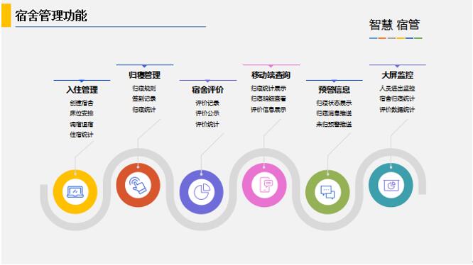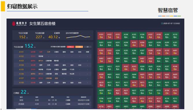 智慧宿管解決方案:融合宿舍調配、人臉通道、歸寢簽到、歸寢數據展示、宿舍評價(jià)、公示提醒、家校推送于一體的針對宿舍公寓場(chǎng)景的安全、管理、服務(wù)解決方案。